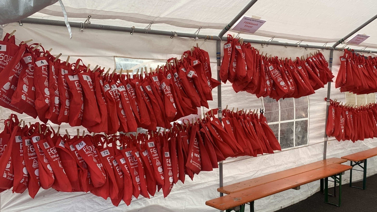 In der Startunterlagenausgabe erhaltet ihr den Starterbeutel mit einem Transponder, einer Teilnehmerinfo, einer Badekappe (muss getragen werden!), eurer Startnummer und Startnummern-Aufkleber für Helm und Rad. Die Nutzung eines eigenen Transponders oder Chips ist nicht möglich.